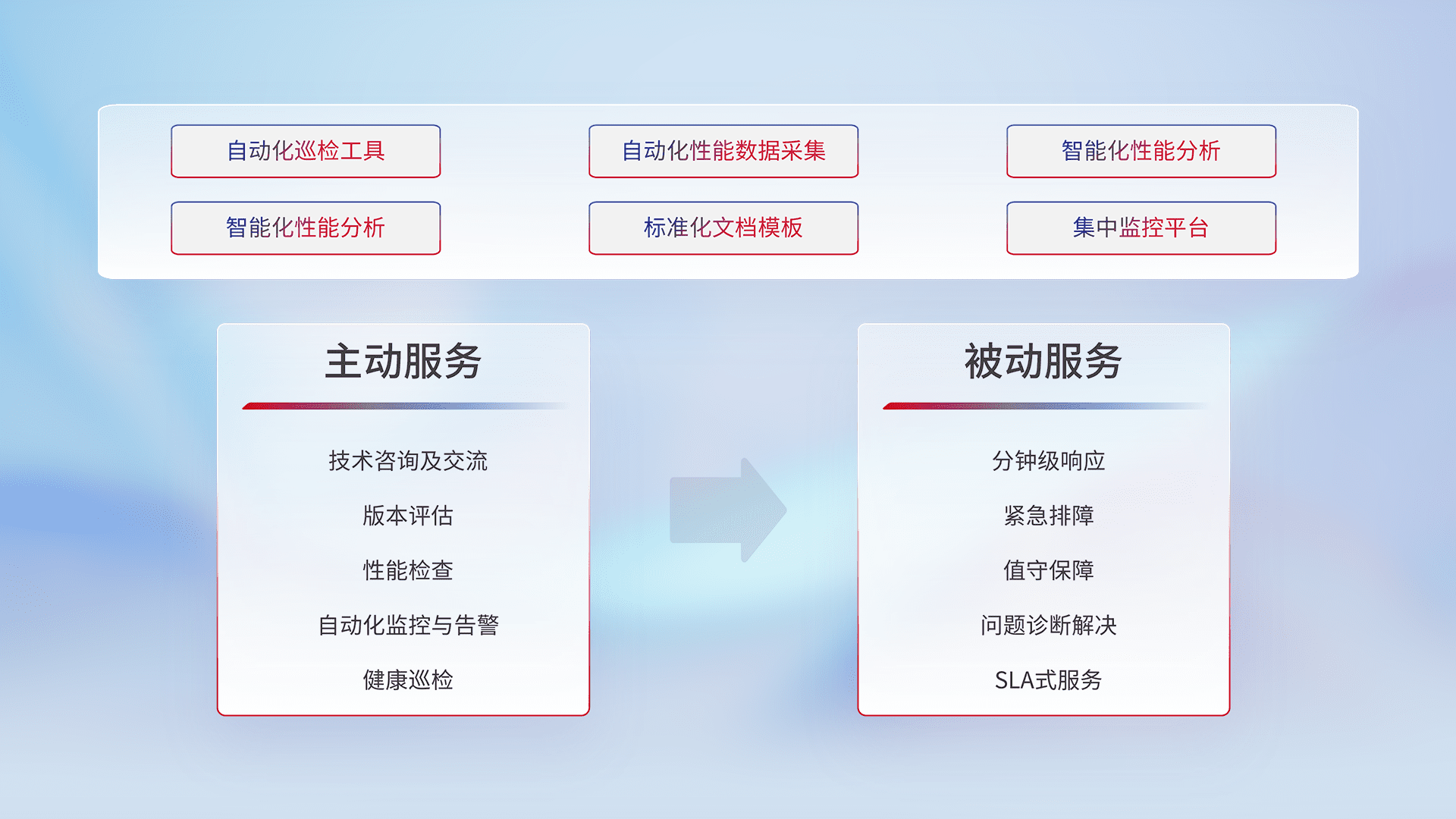 智能化工具和标准化文档,,,保障服务质量,,,,提供主动服务(包含技术咨询、、、版本评估、、、性能检查、、自动化监控与告警、、、、健康巡检)和被动服务包含(分钟级响应、、、紧急排障、、值守保障、、问题诊断解决、、SLA服务)。。。。